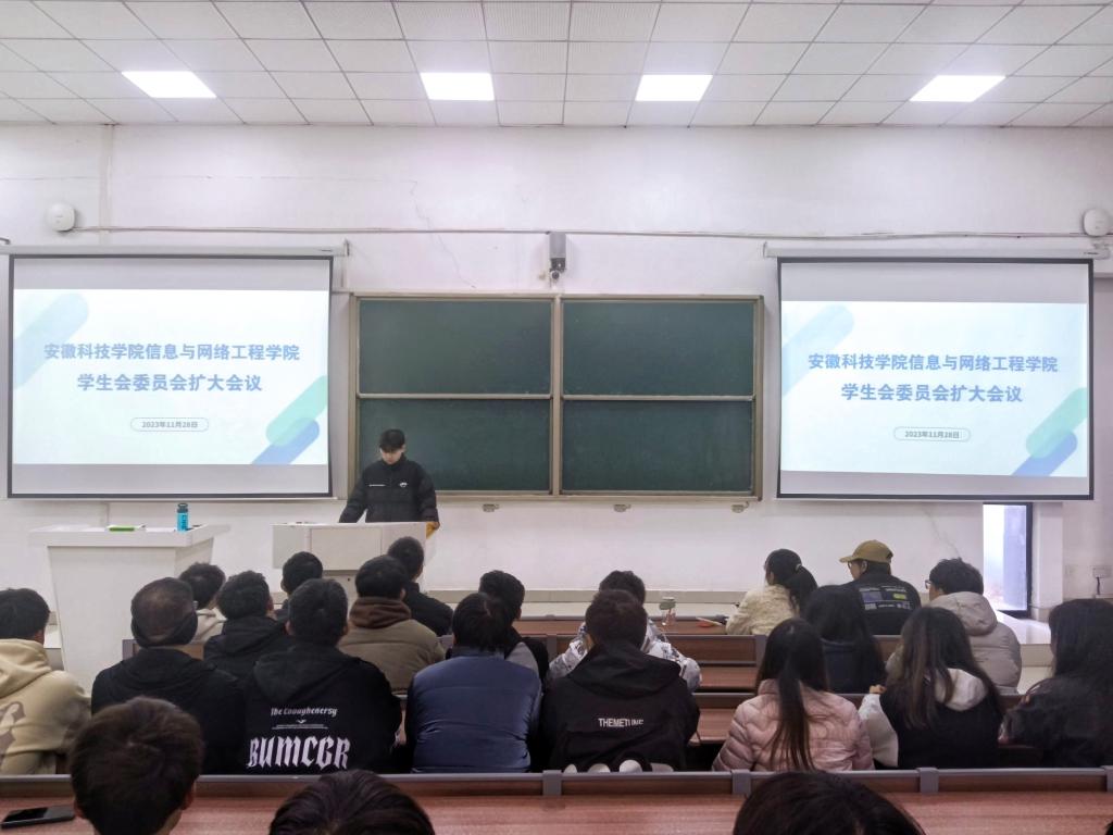 为确保安徽科技学院第十六届学生代表大会的顺利召开,11月28日中午,信息与网络工程学院在致知楼B111召开学生会委员会扩大会议,信息与网络工程学院第七届学生会委员会委员以及全体学生会成员参会,会议由学生会主席许振雨主持。