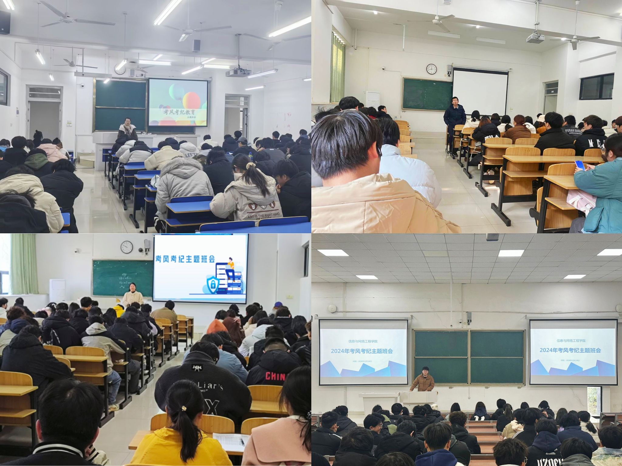 为严肃考风考纪,强化学生诚信考试意识,12月20-27日,信息与网络工程学院各班级陆续召开考风考纪教育主题班会,会议由各班辅导员组织召开。